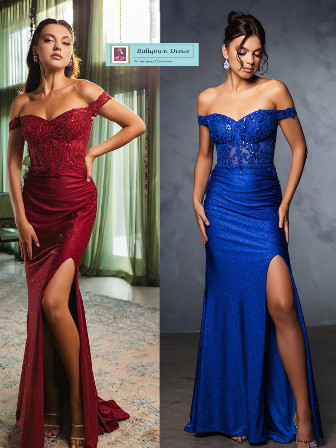 Glamourous fitted dress with lace boned bodice, bardot sleeves, zip back and glitter jersey skirt with thigh high split.