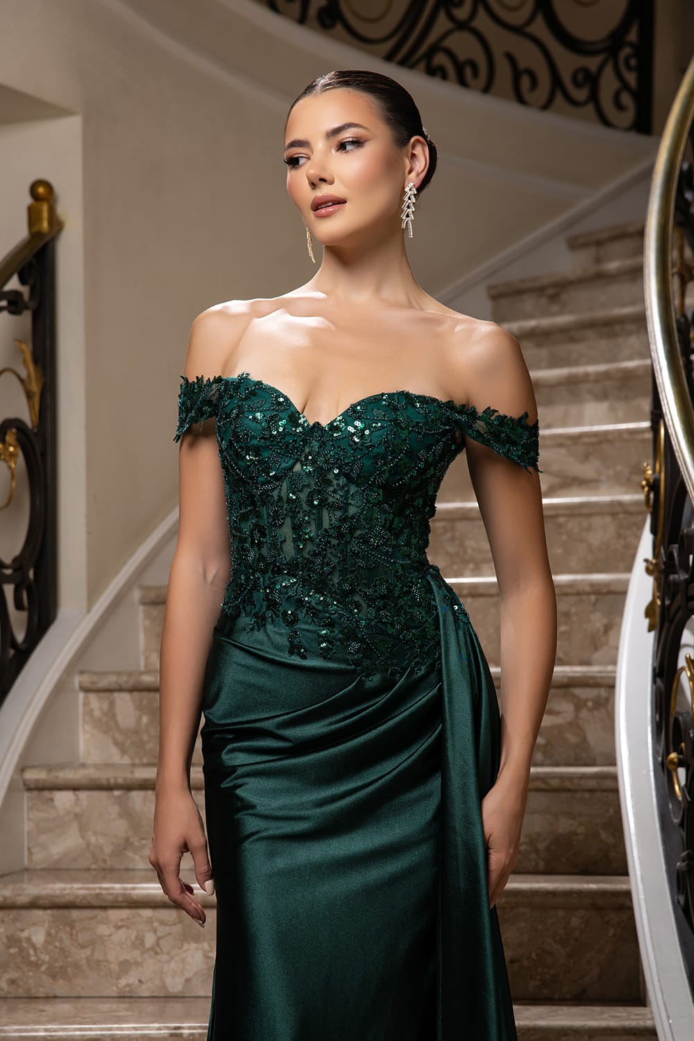 The Ava prom evening dress combines contemporary elegance with flattering silhouette design. Crafted from fitted stretch jersey, this gown moulds beautifully to your curves whilst maintaining comfort throughout the evening. The embellished bodice adds sophisticated glamour, drawing attention to the upper body with intricate detailing. Bardot sleeves create a chic, off-shoulder aesthetic that balances the fitted waist, whilst the delicate train adds a touch of drama and refinement as you move. Perfect for prom, formal events, or special occasions where you want to feel confident and stunning.