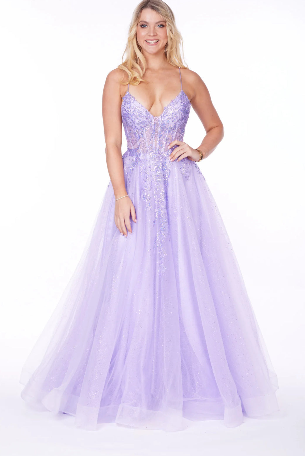 A beautiful tulle Ballgown style dress with boned bodice and corset back, irridescent detailing and multi layered tulle skirt.